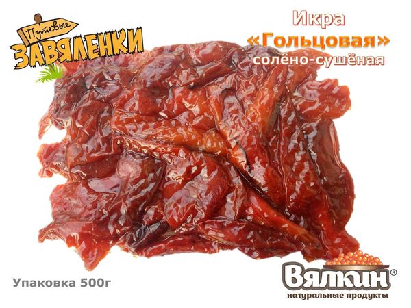 Компания ООО "Вялкин" производит и продает солёно-сушёную икру в ястыках и снеки из икры и морепродуктов оптом в в/у 50 г или 500 г.