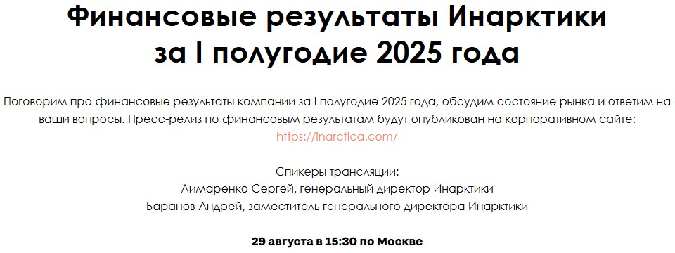 "Инарктика" проведёт открытый вебинар и представит финансовые результаты за первое полугодие 2025 года