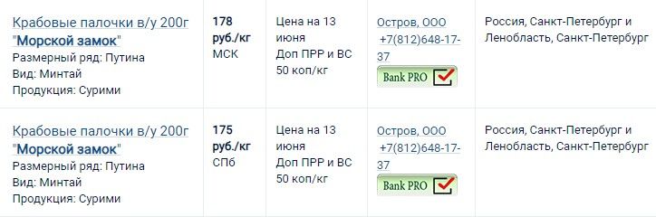 Крабовые палочки ТМ “Морской замок” продаёт компания Остров на Fishnet.ru здесь (см. фото ниже).