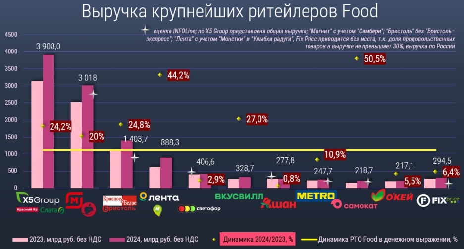 Продажи Х5 и «Магнита» — лидеров рейтинга — за 2024 год выросли на 24,2% (до 3,9 трлн рублей) и 20,3% (до 3 трлн рублей) соответственно. При этом разрыв между ними за минувший год увеличился в 1,4 раза, почти до 890 млрд рублей. Х5 агрессивно росла органически и демонстрировала более сильный рост LFL-продаж, а по итогам IV квартала 2024 года вернула себе лидерство на рынке online-продаж продовольственных товаров, в том числе за счет высоких темпов роста в регионах и централизации управления e-grocery.