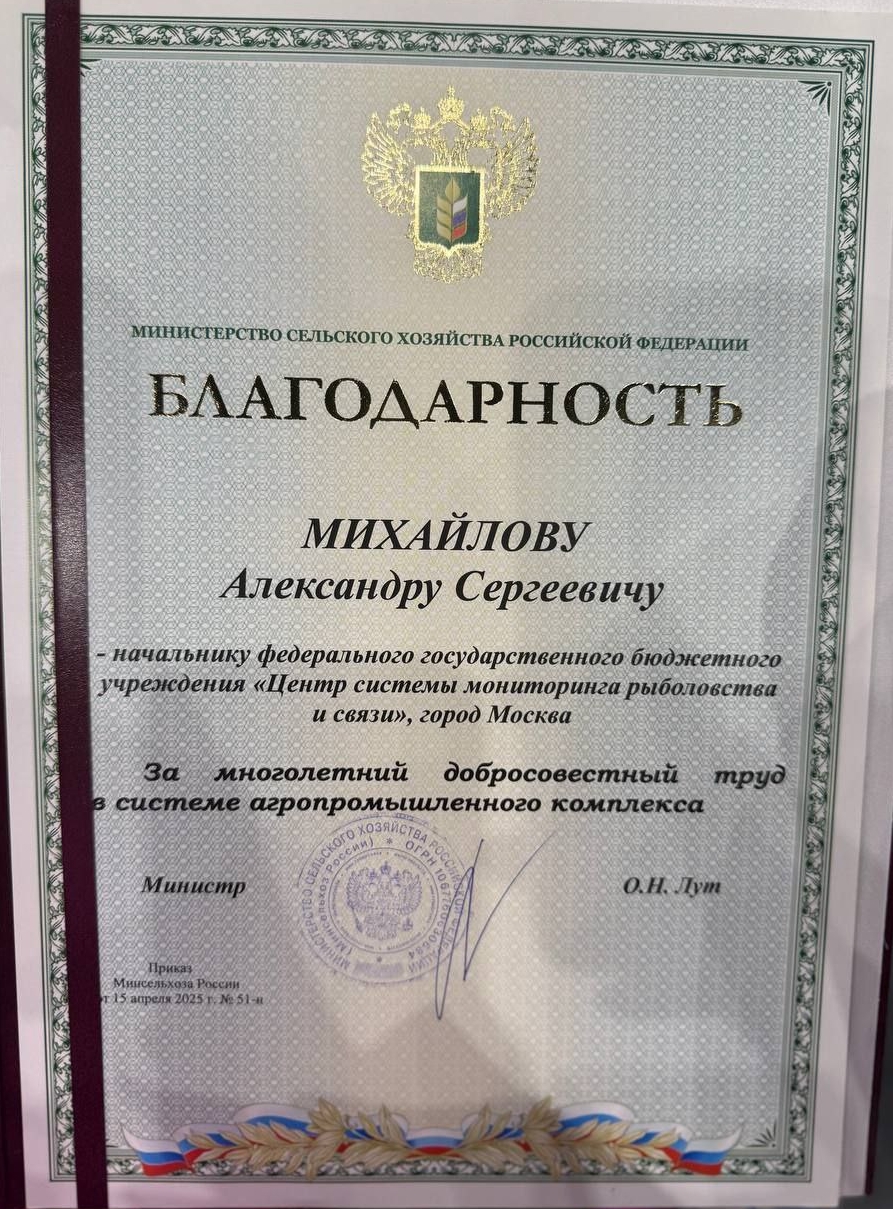 Руководителю Центра системы мониторинга рыболовства и связи (ЦСМС) Александру Михайлову объявлена благодарность Минсельхоза России за многолетнюю добросовестную работу, направленную на развитие агропромышленного комплекса нашей страны.