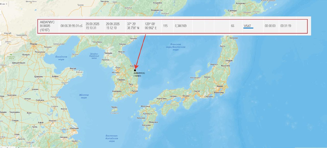 Рыбопромысловое судно "Аквариус" с установленным на борту комплексным техническим средством контроля (ТСК), которое включает судовую земную станцию "Гонец", судовую аппаратуру автоматической идентификационной системы (АИС) и в качестве дополнения терминал VSAT, успешно передавало позиции из южнокорейского порта Тонхэ (широта: 37°32′38″ с. ш.; долгота: 129°06′25″ в. д.).