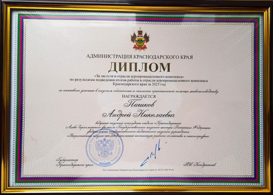 В рамках церемонии награждения были вручены государственные и краевые награды, символизирующие признание заслуг работников отрасли. Среди награжденных — Пашков Андрей Николаевич, ведущий научный сотрудник отдела «Краснодарский» Южного филиала ГНЦ РФ «Всероссийский научно-исследовательский институт рыбного хозяйства и океанографии» (ВНИРО). По итогам работы агропромышленного комплекса в 2025 году ему был вручен диплом «За активное участие в научном обеспечении и практической поддержке животноводства».