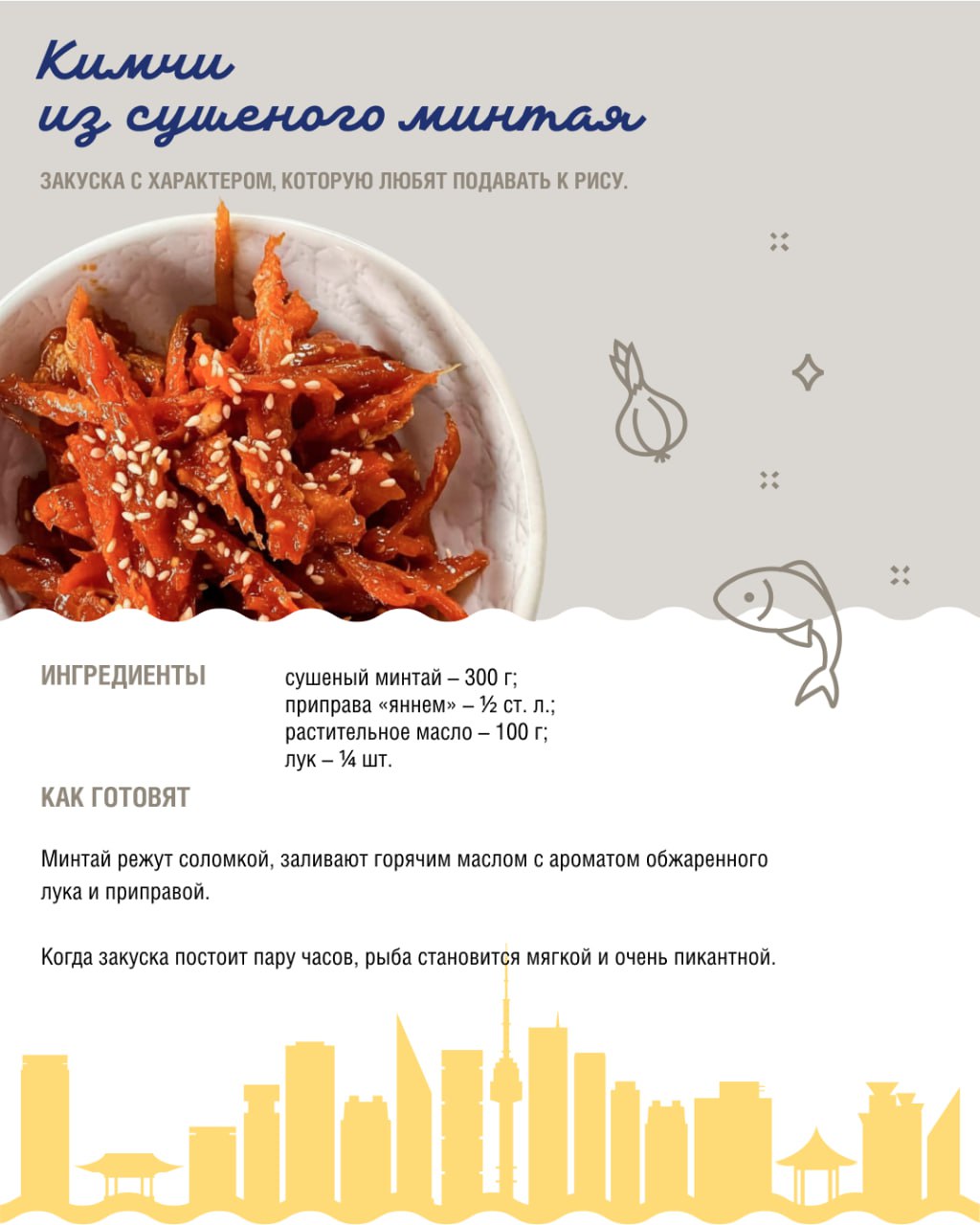 Из минтая там готовят легкие согревающие супы, острые закуски, кимчи. Неспроста к нам название этой рыбки пришло из Кореи.
