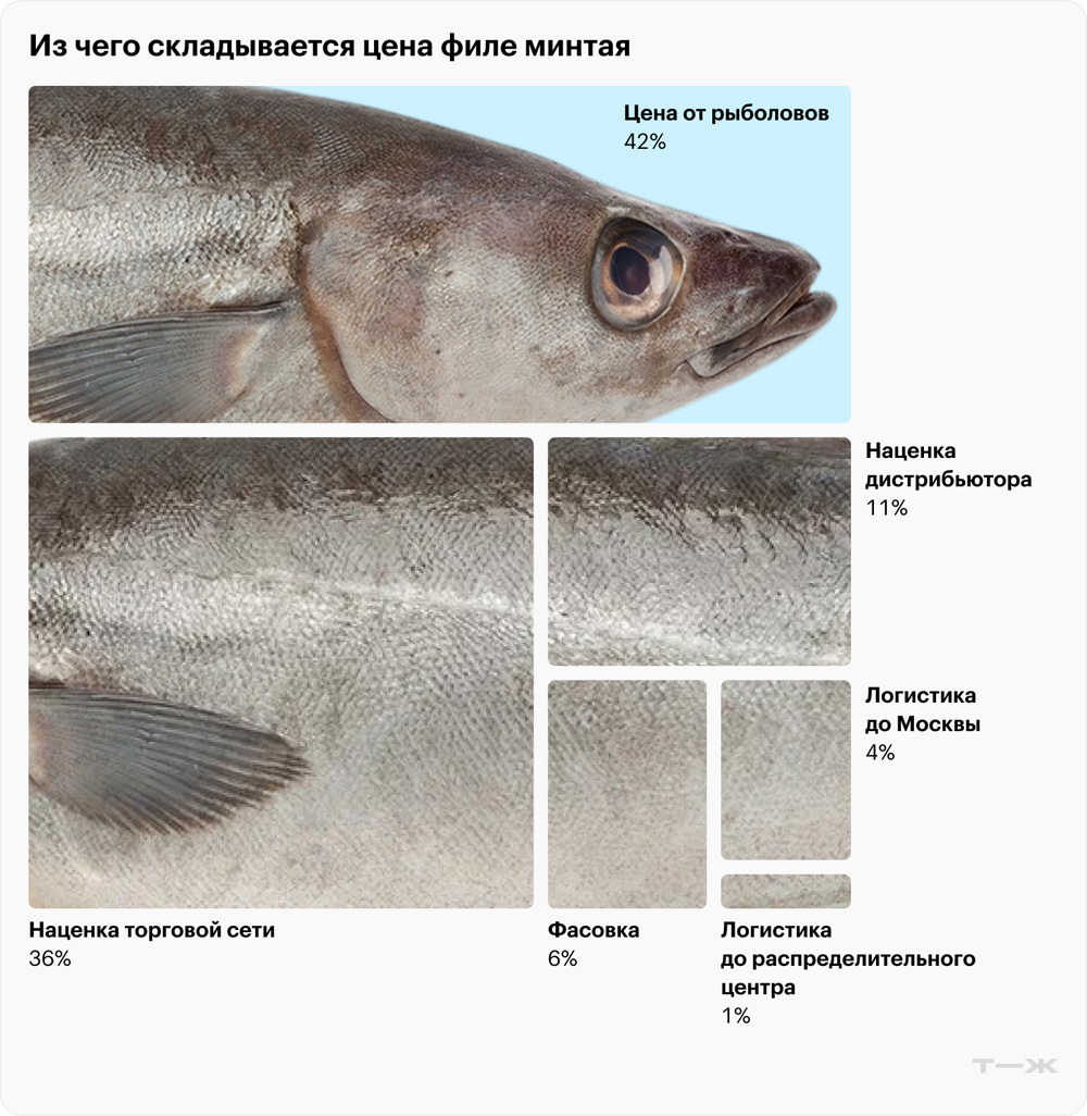 В итоговой стоимости килограмма свежемороженого филе минтая 42% приходится на цену от рыболовной компании, по которой она продает свой товар дистрибьютору. Рыбаки несут высокие затраты: деньги идут на обслуживание флота, проценты по кредитам на строительство судов, зарплаты, топливо, амортизационные расходы.