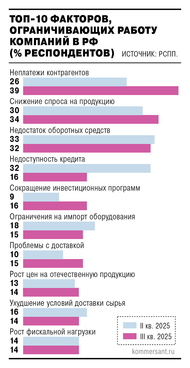 Такой ответ дали в третьем квартале 2025 года 39% опрошенных РСПП в рамках мониторинга представителей бизнеса. Значение этого фактора существенно выросло за прошедшие месяцы — по итогам второго квартала невыполнение обязательств со стороны партнеров как основную проблему указали чуть более четверти опрошенных. РСПП, напомним, предупредил об этой проблеме еще весной, предложив ввести комплексное наблюдение за платежами, поощрять своевременные расчеты, а в рамках госзаказа закрепить предоплату контрактов на уровне 75% их стоимости. В то же время проблема неплатежей год назад также выходила на первое место среди названных бизнесом, что позволяет говорить о ее сезонном характере; отчасти она может объясняться переносом Минфином значительной доли финансирования госзаказа на начало года.