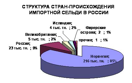 За последний период, на долю Норвегии приходиться 85% поставляемой в Россию сельди, мойвы - 33% и скумбрии - 23%, соответственно. Среднегодовой объем темпа прироста импорта по данным группам норвежской рыбопродукции составляет свыше 20-25%. При этом отмечает Митупов Тимур, в 2007 г. по отношению к 2006 г. прирост импорта только по сельди составляет 14,6 % и достиг объема 251 тыс. тн.. При этом он констатирует, что рост импорта преимущественно произошел из Норвегии, так Норвегия экспортировала в Россию сельди на 24,1 % больше чем в 2006 г. и достигла объемов 216 тыс. тн., в то время, как Исландия снизила объемы поставок в Россию в 3 раза с 12 тыс. тн. в 2006 г. до 4 тыс. тн. в 2007 г. Для сравнения, в 2006 году Норвегия экспортировала в РФ 197,3 тысячи тонн пелагических видов рыбы на $198,6 млн.