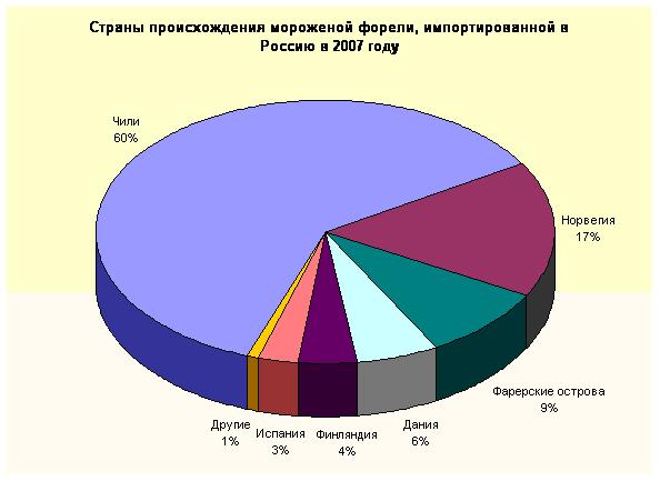 Общий импорт мороженой форели в Россию в 2007 году снизился на 4% с 23.343 тонн до 22.495 тонн относительно 2006 года.