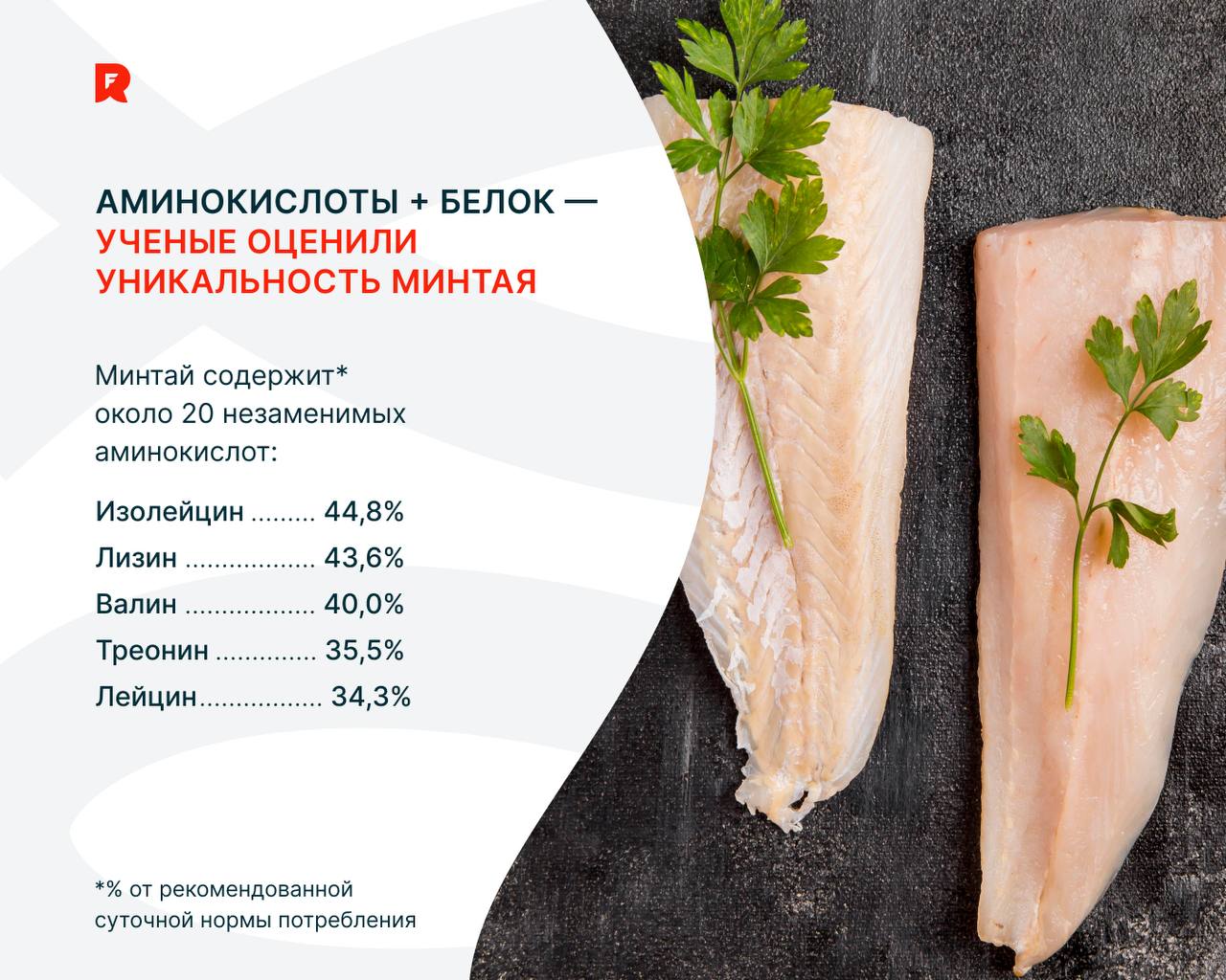 Кроме того, минтай содержит около 20 незаменимых аминокислот, среди которых: