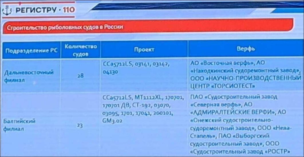 Из 73 судов, которые находятся сейчас в постройке под надзором регистра, 72 строится на российских верфях и одно — в Турции. В том числе и краболовы. Строительство 28 судов ведется для просмотра ссылки зарегистрируйтесь или войдите.