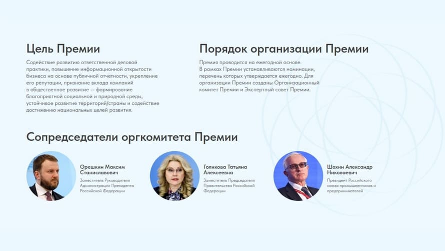 Напомним, премия «Лидеры ответственного бизнеса» проводится с 2023 года при поддержке Правительства, Совфеда и Госдумы. Оператором проекта выступает РСПП. В этом году генеральным партнёром премии стал Российский союз работодателей-рыбопромышленников.