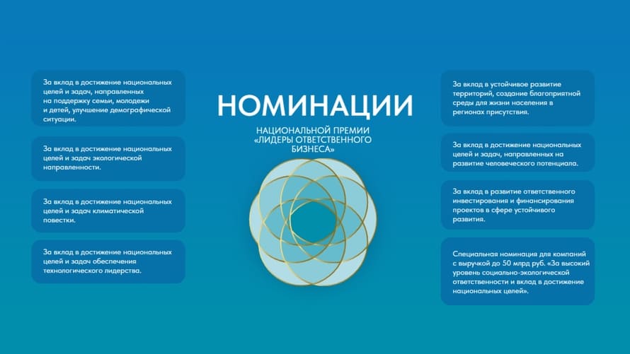 Цель премии «Лидеры ответственного бизнес» — содействие развитию ответственной деловой практики, укрепление репутации бизнеса и признание вклада компаний в формирование благоприятной социальной и природной среды. К участию приглашаются крупные российские компании, соблюдающие принципы ответственного ведения бизнеса и раскрывающих информацию об этом в публикуемой отчетности. Номинации охватывают все социальные сферы: от поддержки семьи и вклада в улучшение демографии страны до финансирования проектов устойчивого развития.
