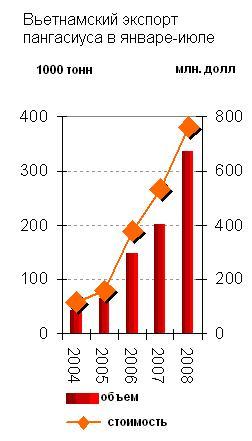 В первой половине 2008 года Вьетнам экспортировал 263.000 тонн пангасиуса, что на 53% больше, чем в тот же период 2007 года. По стоимости экспорт составил 608 млн. долл, что на 34% больше. Данные по стоимости экспорта говорят о снижении средней экспортной цены с 2,70 долл/кг в первой половине 2007 года до 2,30 долл/кг в тот же период 2008 года.