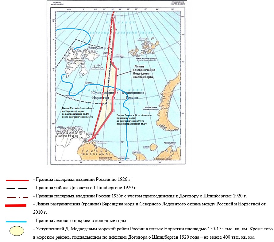 Почему «Президент Полубаренцевоморский»? Да по тому, что он «не за понюх табака» отдал норвежцам под их юрисдикцию самую продуктивную с точки зрения рыболовства западную часть Баренцева моря, включая и район Договора о Шпицбергене от 1920 года. Более того исходя из ряда положений Договора 2010 года, Российская Федерация фактически еще и отказалась от западной Границы полярных владений 1926 года, как она проходила ранее до подписания этого договора. Все арктические государства, включая и Норвегию, не возражали против Границы полярных владений СССР от 1926 года на протяжении 84 лет его существования.