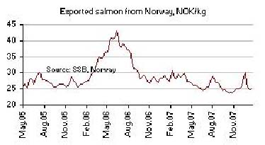 В соответствии с данными исследовательской группы исландского банка Glitnir, цены на лосося находятся в стадии затяжного снижения. С начала года европейские цены килограмма лосося упали на 12,8 % от NOK 28,8 до 25,1. Ситуацией очень довольны такие процессоры, как Alfresco (владелец шотландского завода Fare Salmon), Icelandic Group, а также производители Великобритании. Текущие цены - ниже средних за 2007 г. (NOK 26,7 /кг). крон в кг. В свою очередь, такая ситуация с ценами не может удовлетворять фермерские хозяйства в Норвегии. Два года назад экспортная стоимость норвежского лосося составляла почти 30 норвежских крон за килограмм. Ситуация для процессоров была очень опасной, когда казалось, что производители фактически сами управляют рынком. Норвегия каждую неделю стабильно экспортирует около 8 000 т лососей. За последние пару лет скандинавская промышленность подверглась серьезной реструктуризации. Некоторые местные банки вложили свои пакеты акций в несколько наиболее крупных компаний –производителей лосося. Большого энтузиазма они при этом не испытывали. Акционерами становились по принуждению – с целью защиты части средств, которые им задолжали нерентабельные фермы. С тех пор новые инвестиции поступили от судоходных компаний. В прошлом году промышленность обвинялась в попытках повышения цен и сокращения производства.Полученные данные также подтверждают ситуацию в Великобритании, где цены на белую рыбу вообще были очень высоки, в то время, как цены на лосося оставались довольно устойчивыми. Фактически цена могла меняться только в случае штормовой погоды, когда с шотландских ферм нельзя было собрать выращенную рыбу.