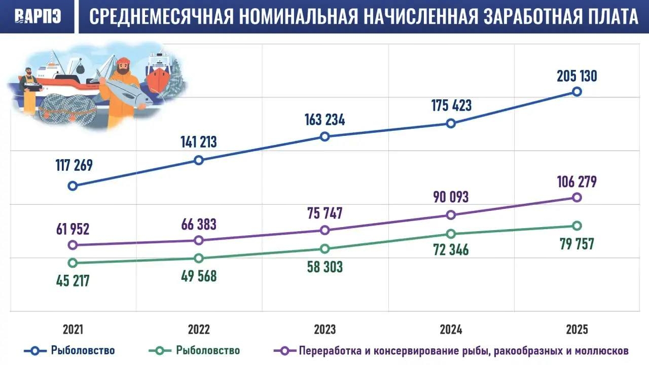 Самые высокие зарплаты традиционно в секторе рыбодобычи — ₽201,5 тыс. по итогам 2025 года. Сектор продемонстрировал и самый высокий прирост за минувшую пятилетку — 77,5%.