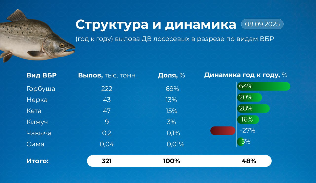 Красная путина-2025: к 8 сентября 2025 года вылов тихоокеанских лососей на Дальнем Востоке достиг 321 тыс. тонн — на 48% больше показателя на аналогичную дату 2024 года.
