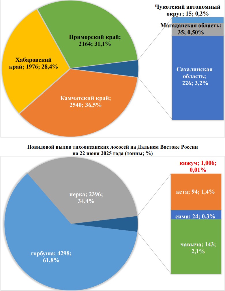 Суммарный объем вылова тихоокеанских лососей на Дальнем Востоке России по данным территориальных управлений Росрыболовства по состоянию на 22 июня 2025 года составил 6 956 тонн, из них: