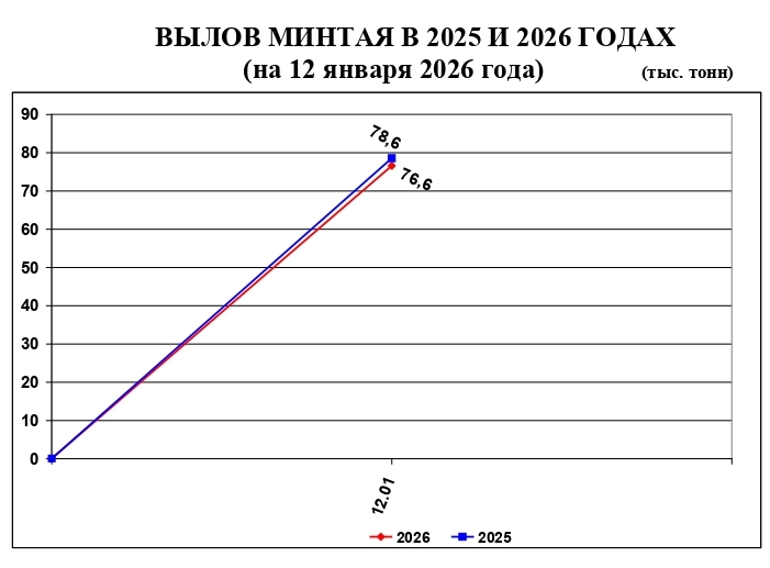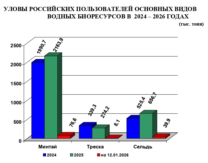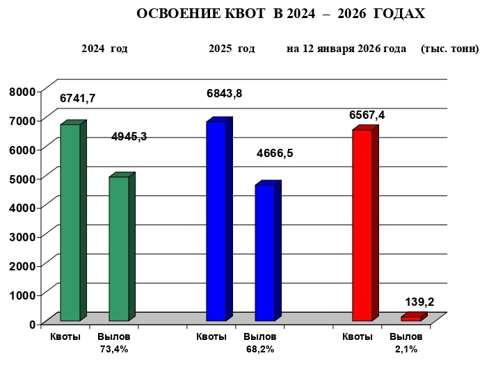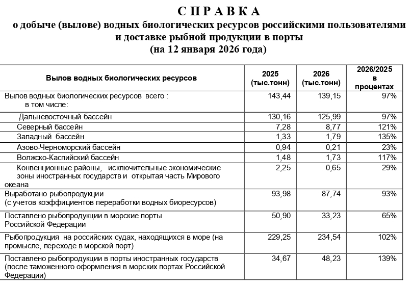 По данным отраслевой системы мониторинга Росрыболовства (ЦСМС), общий объём добычи (вылова) водных биоресурсов всеми российскими пользователями по состоянию на 12 января 2026 г. составил 139,2 тыс. тонн, что на 4,3 тыс. тонн меньше уровня предыдущего года (или на 3,0% меньше уровня 2025 года, здесь и далее – за аналогичный период с начала года).