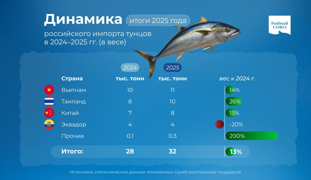 Российский импорт тунцов в 2025 году вырос (год к году) на 13% в весе и на 22% в деньгах, по данным таможенных служб иностранных государств.