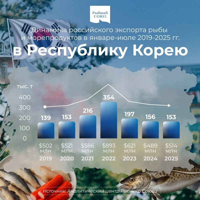 Российский рыбный экспорт в Республику Корея в январе-июле 2025 года снизился (год к году) на 2% в весе и вырос на 5% в деньгах, до 153 тыс. тонн на сумму $514 млн, подсчитал аналитический центр Рыбного союза на основе данных южнокорейской таможенной службы.