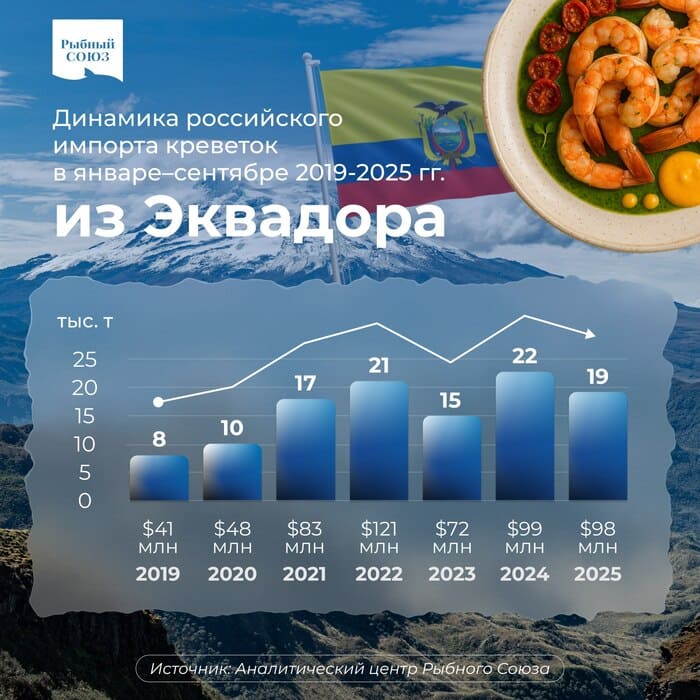 Снижение объемов поставок аквакультурных креветок из Эквадора в Россию произошло на фоне увеличения (год к году) общего эквадорианского экспорта креветок за первые 9 месяцев 2025 года на 15% в натуральном и 25% в стоимостном выражении, до 1 млн тонн на сумму $5,5 млрд. Прогнозируется, что по итогам 2025 года объем экспорта креветок из Эквадора станет рекордным и составит $8 млрд.