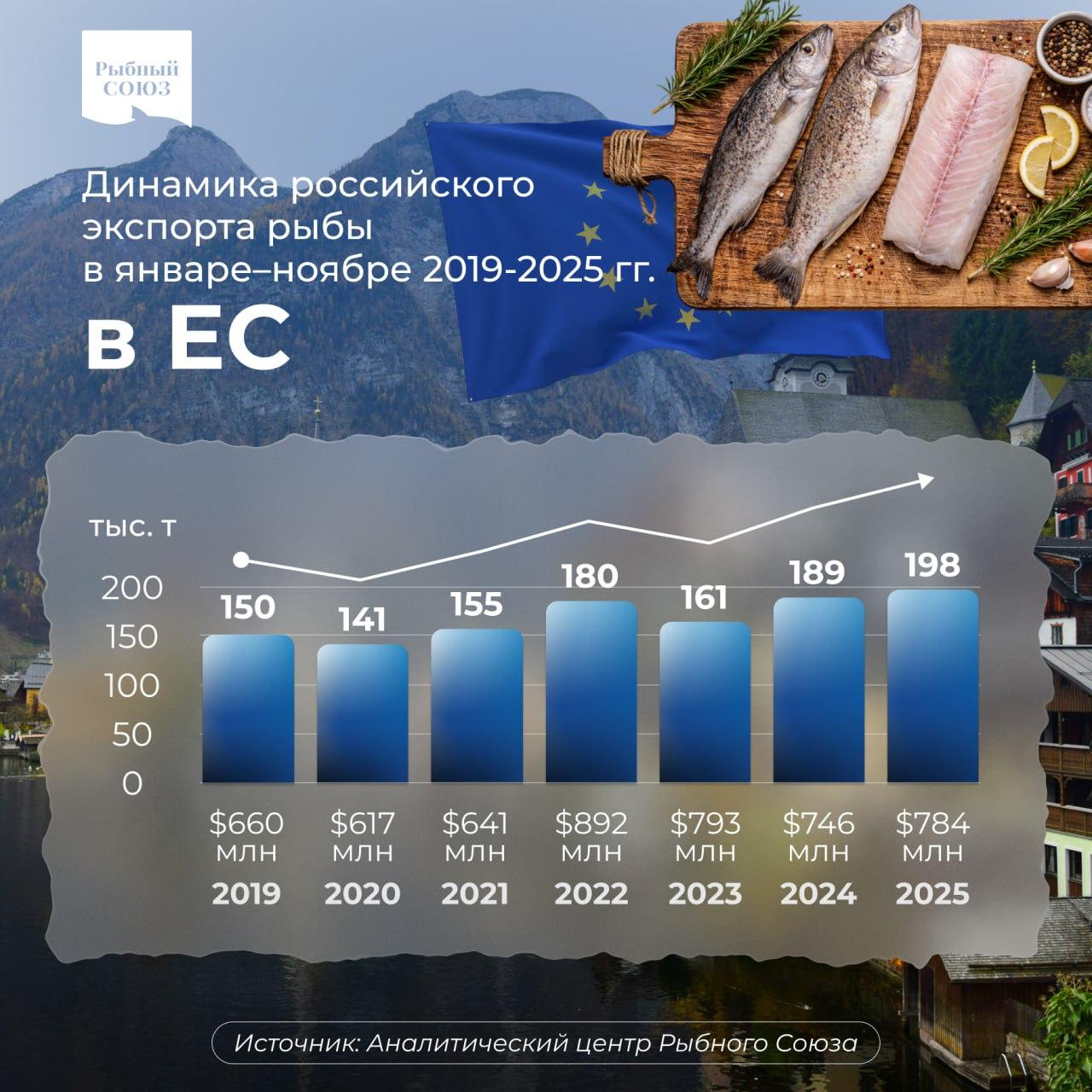 Российский экспорт рыбы в ЕС за 11 месяцев 2025 года вырос (год к году) на 5% в весе и на 5% в деньгах, до 198 тыс. тонн на $784 млн, по данным Евростата.