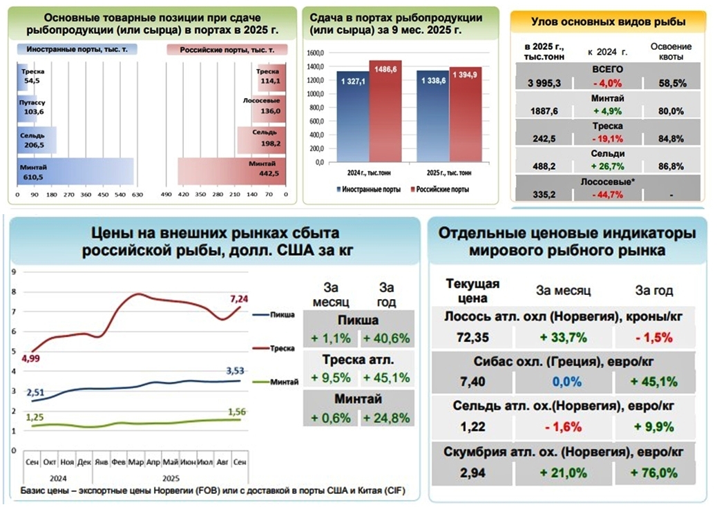 Оптовые цены внутреннего рынка – оценка на основе данных издания «Рыбный Курьер-Профи» (Fishnet.ru) и рыботорговых площадок в сети Интернет. Цены внешнего рынка – FAO GLOBEFISH. Розничные цены – Росстат. Улов, сдача в портах – ФГБУ ЦСМС.