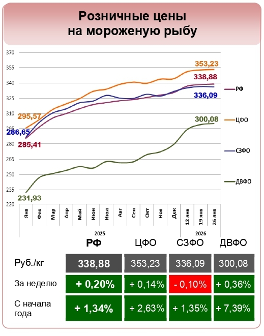 За прошедший период с 26 января по 1 февраля 2026 года цены на мороженую рыбу в оптовом сегменте внутреннего рынка демонстрировали положительную динамику.