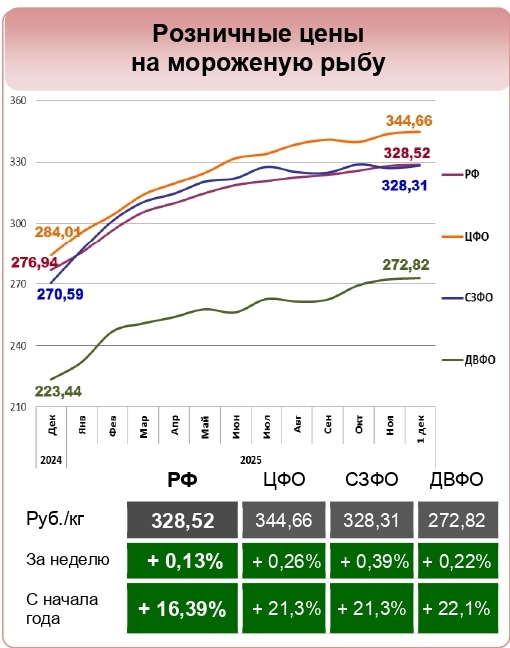За прошедшую неделю с 1 по 7 декабря 2025 года динамика цен на мороженую рыбу в оптовом сегменте внутреннего рынка демонстрировала, в основном, тенденцию к стабильности.