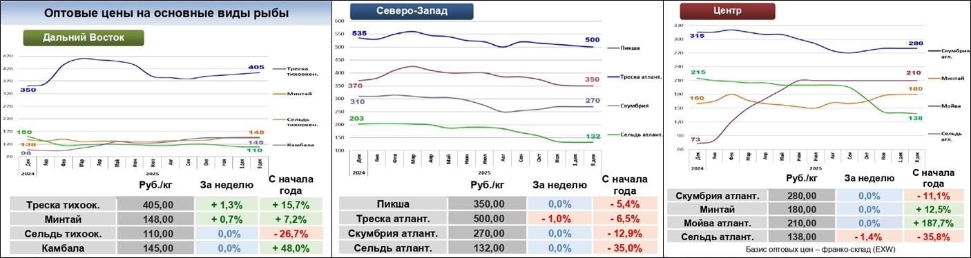 На Северо-западе (Мурманск, Санкт-Петербург) в условиях колебаний курса рубля наблюдался понижательный тренд цен на треску, в то же время цены на другой популярный ассортимент мороженой рыбы не изменились.