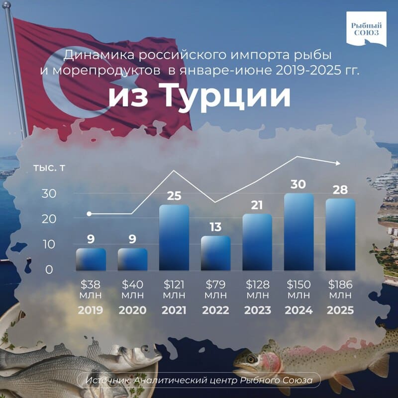 Российский импорт рыбы из Турции в январе-июне 2025 года снизился (год к году) на 4% в весе и вырос на 23% в деньгах, до 28 тыс. тонн на сумму $186 млн.