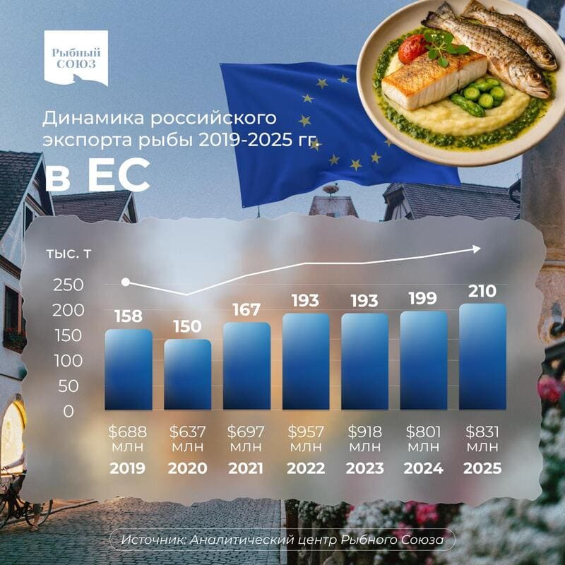 Российский экспорт рыбы в ЕС в 2025 году вырос (год к году) на 5% в весе и деньгах, до 210 тыс. тонн на сумму $830 млн, по данным Евростата.