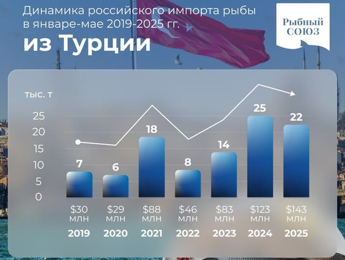 Российский импорт рыбы и морепродуктов из Турции в январе-мае 2025 года снизился (к аналогичному периоду 2024 года) на 10% в весе и вырос на 15% в деньгах – до 22 тыс. тонн на сумму $143 млн.