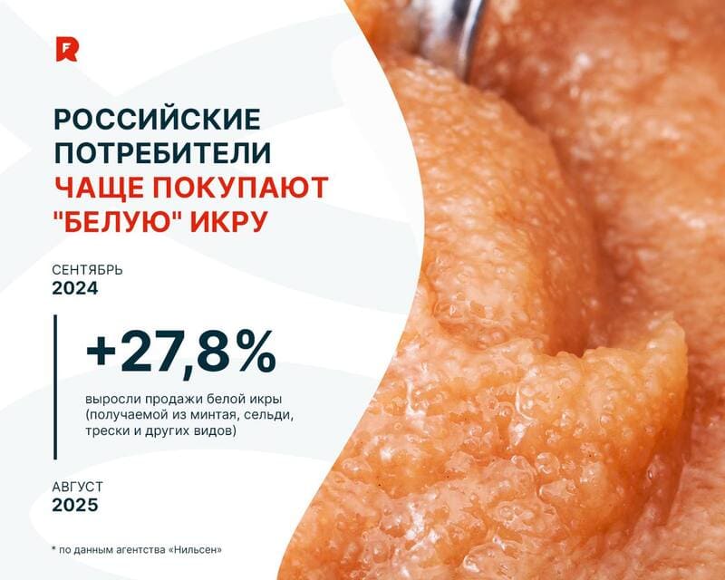 По данным агентства «Нильсен»*, с сентября 2024 по август 2025 года продажи белой икры (получаемой из минтая, сельди, трески и других видов) выросли на 27,8%, в натуральном выражении по сравнению с аналогичным периодом предыдущего года, при этом спрос на традиционную красную икру снизился на 32,6%.
