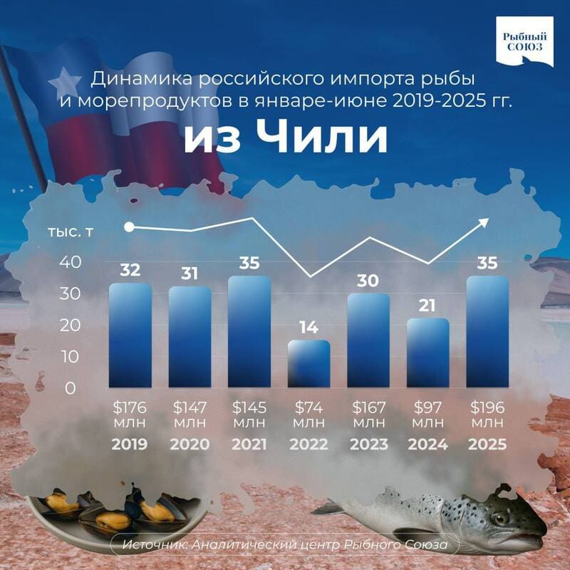 Российский импорт рыбы и морепродуктов из Чили в январе-июне 2025 года вырос (год к году) на 70% в весе и увеличился на 100% в деньгах, до 35 тыс. тонн на сумму $196 млн, отмечает Аналитический центр Рыбного союза, опираясь на данные чилийской таможенной службы.