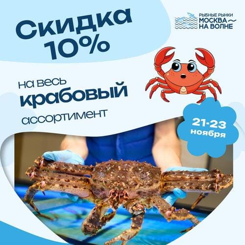 С 21 по 23 ноября на рыбных рынках «Москва — на волне» (в Митине и Косино-Ухтомском) будет действовать скидка 10 процентов на весь крабовый ассортимент. Акция распространяется на отдельные части, на целых морских гигантов, консервы и другую продукцию с крабовым мясом.