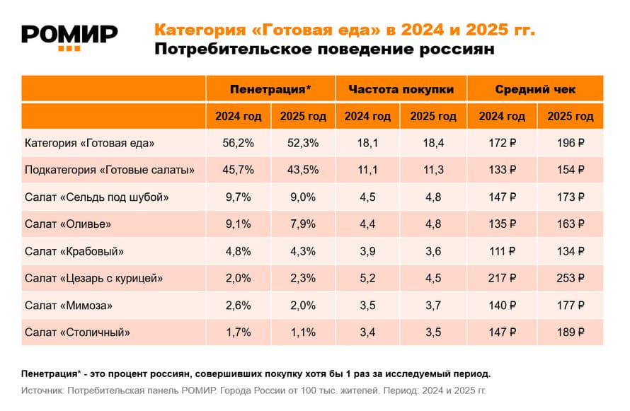 Данные Потребительской панели РОМИР показали, что 44% россиян хотя бы раз в 2025 году совершили покупку готовых салатов.
