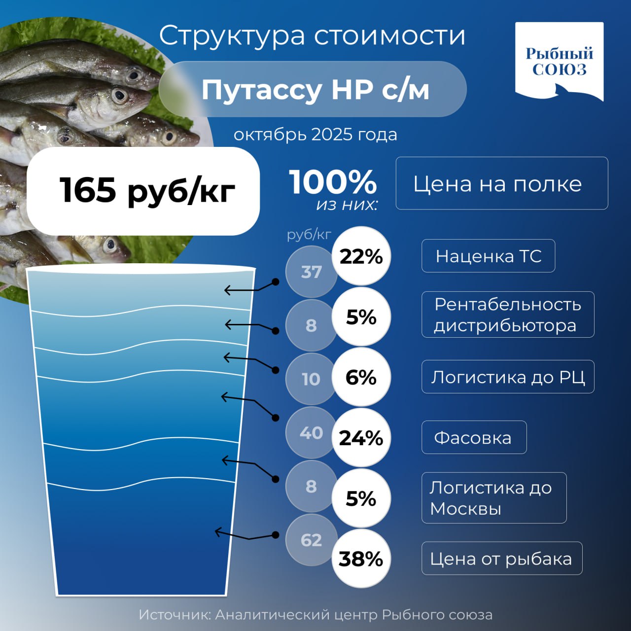 На инфографике — структура стоимости ("ценовой стакан") свежемороженой путассу неразделанной. Это средняя розничная цена в Центре России.