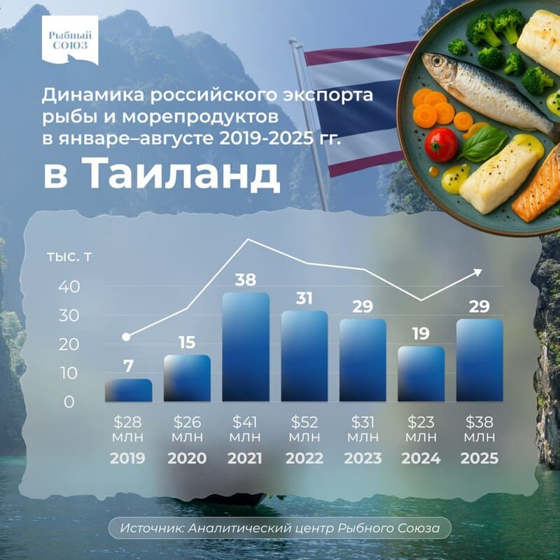 Российский экспорт рыбы и морепродуктов в Таиланд в январе-августе 2025 года вырос (год к году) на 50% в весе и на 60% в деньгах, до 29 тыс. тонн на сумму $38 млн, по данным тайской таможенной службы.