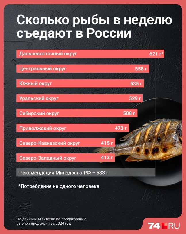 В Уральском федеральном округе по потреблению рыбы на первых позициях Курганская область — 36,5 кг на человека в год. Далее идут Тюменская и Свердловская области — по 29,9 и 24,2 кг. Уровень потребления рыбы в Челябинской области в 2024 году снизился до 19,3 кг, тогда как в 2013 году было 23,7 кг на человека.