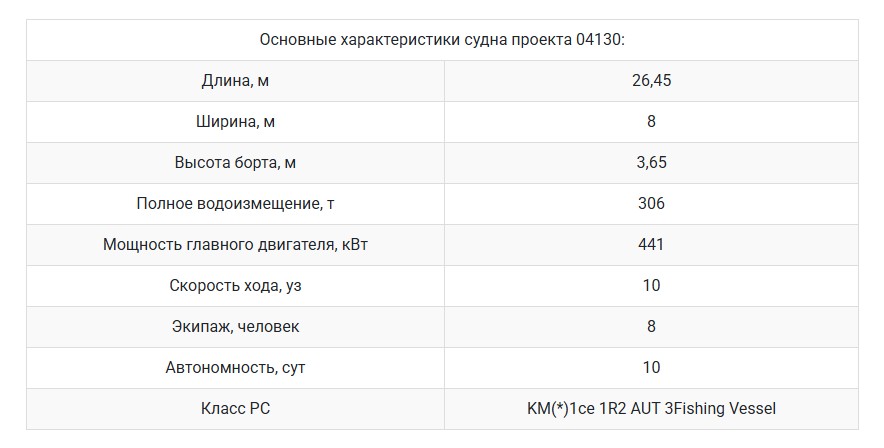 Судно проекта 04130 представляет собой малый рыболовный сейнер длиной 26,5 метра с широким корпусом и вместительным трюмом. Хотя по размеру он близок к старым МРС-150, это уже не «маломерка», а современное судно для прибрежного лова с улучшенными характеристиками и возможностями, специально спроектированное для работы в условиях Камчатки.