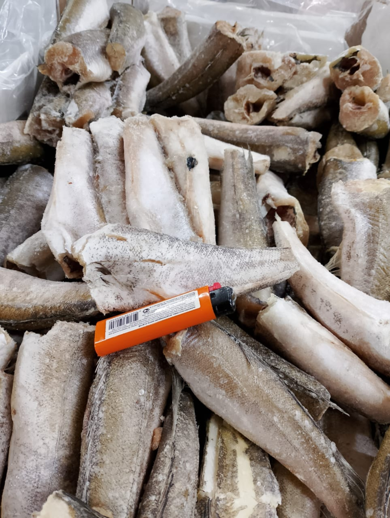 В своём уездном городе в прошлом году видел продукцию, кажется Океанрыбылота - тушка минтая без хвоста и головы, упакованные в блок-лайнер. Вес коробки, кажется 2кг, но могу ошибаться. По внешнему виду тушка очень похожа на хек.