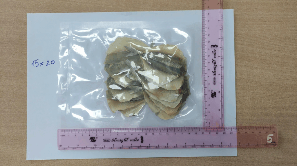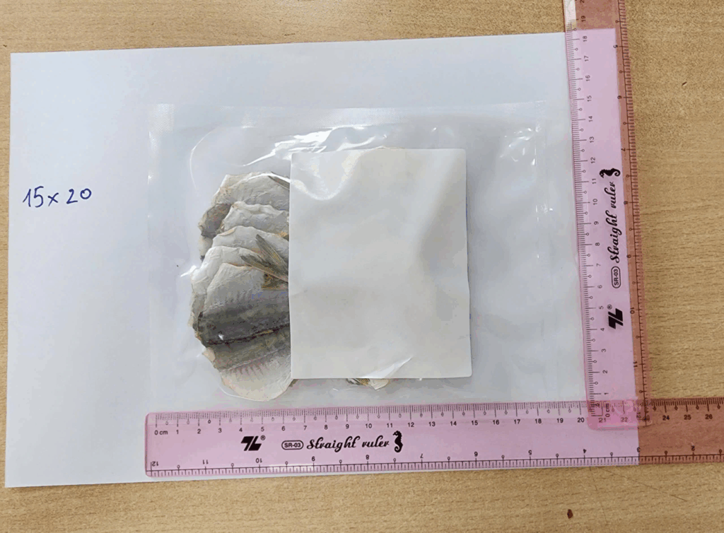 Возможна упаковка солёно-сушеной рыбы в бюджетную розничную упаковку — 50 г полиэтиленовый пакет со стикером.
